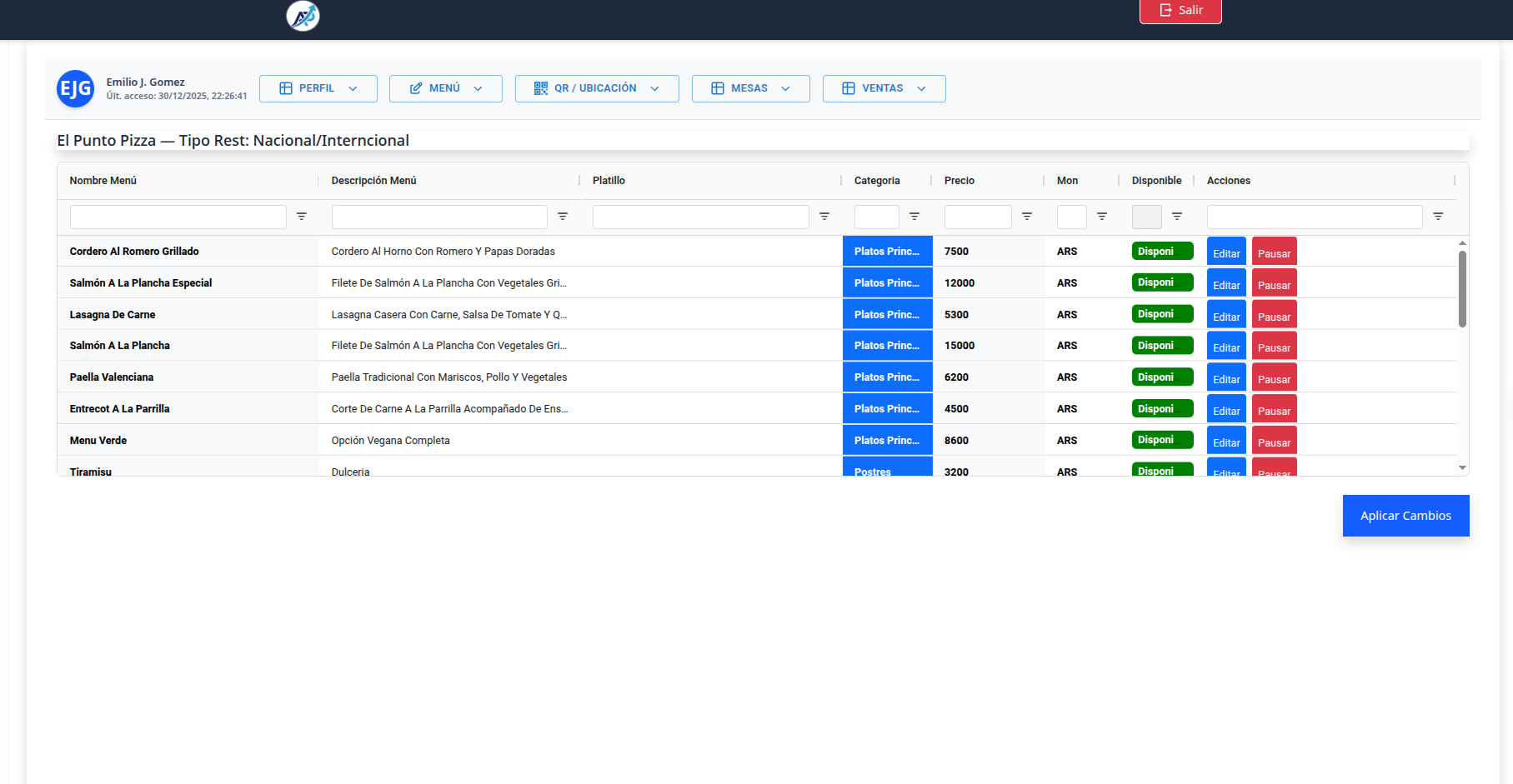 - Parte privada: los restaurantes gestionan menú, precios, disponibilidad y promociones en tiempo real.